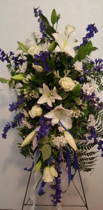 Standing Sprays Wreaths. Standing spray arrangement of fresh blue delphinium gathered with white roses lilies mums stock carnations and more Appropriate for family friends or business associates to send directly to the funeral home Our florists use only the freshest flowers available so colors and varieties may vary Large measures approximately 52H x 42L without easel Medium measures approximately 46H x 38L. White roses lilies mums blue delphinium and carnations are arranged and accented by blue satin ribbon and standing on an easel this standing spray is an a way to honor and cherish the life of your loved one.