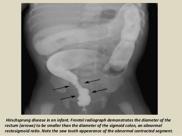 Symptoms usually become apparent in. In Hirschsprung disease a part of the large intestine lacks normal nerve cells. An x-ray is a picture created by using radiation and recorded on film or on a computer. This may indicate a bowel blockage. Hirschsprungs disease HD also known as congenital aganglionic megacolon disease is a congenital disease in which ganglionic cells fail to develop in the large intestine. Other symptoms may include vomiting abdominal pain diarrhea and slow growth. Hirschsprungs disease HD or HSCR is a birth defect in which nerves are missing from parts of the intestine.