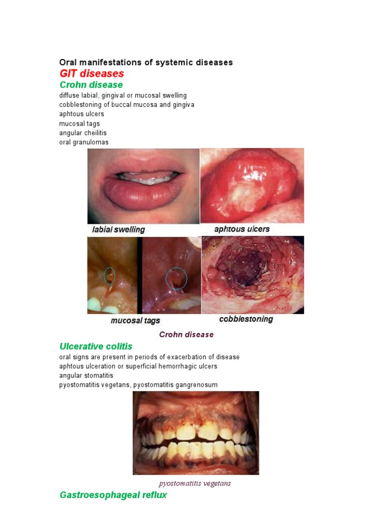 Oral signs of Crohn disease. There is no clear or expected pattern of gastrointestinal Crohns disease presenting with oral manifestations. 21 linhas Additional oral findings in patients with Crohn disease may include diffuse. In most patients lesions are asymptomatic but. 21640063 Indexed for MEDLINE MeSH terms. Conclusion The detection of specific oral manifestations often preceded by painless gingival enlargement diffuse lip and buccal mucosal swelling oral cobblestoning buccal sulcus ulceration and mucosal tags andor unspecific or ancillary ones. Approximately one-third of Crohn disease patients develop extraintestinal manifestations. It is now known that the lips are the most frequent site of oral Crohns disease OCD lesions. Gastrointestinal symptoms are predominant in Crohns disease.