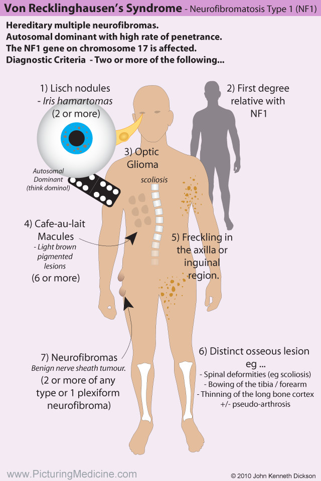 For a general discussion of the underlying condition please refer to the article on neurofibromatosis type 1. The disease can also affect the skin and cause bone deformities. Skeletal deformations like scoliosis can be a symptom of Von Recklinghausens disease.