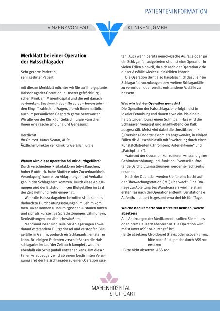 Entzündlich oder degenerativ sein. Die Operation besteht in einer Ausschälung Thrombendarterektomie der betroffenen Halsschlagader Arteria Carotis. Damit das Blut weiterhin zum Kopf beziehungsweise Gehirn fließen kann wird für die Zeit der OP eine Umgehung durch einen Kunststoffschlauch gelegt.