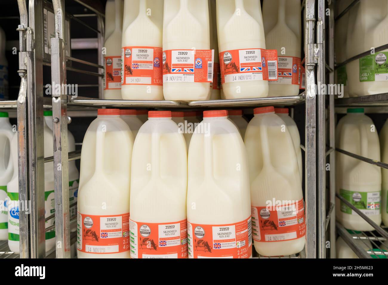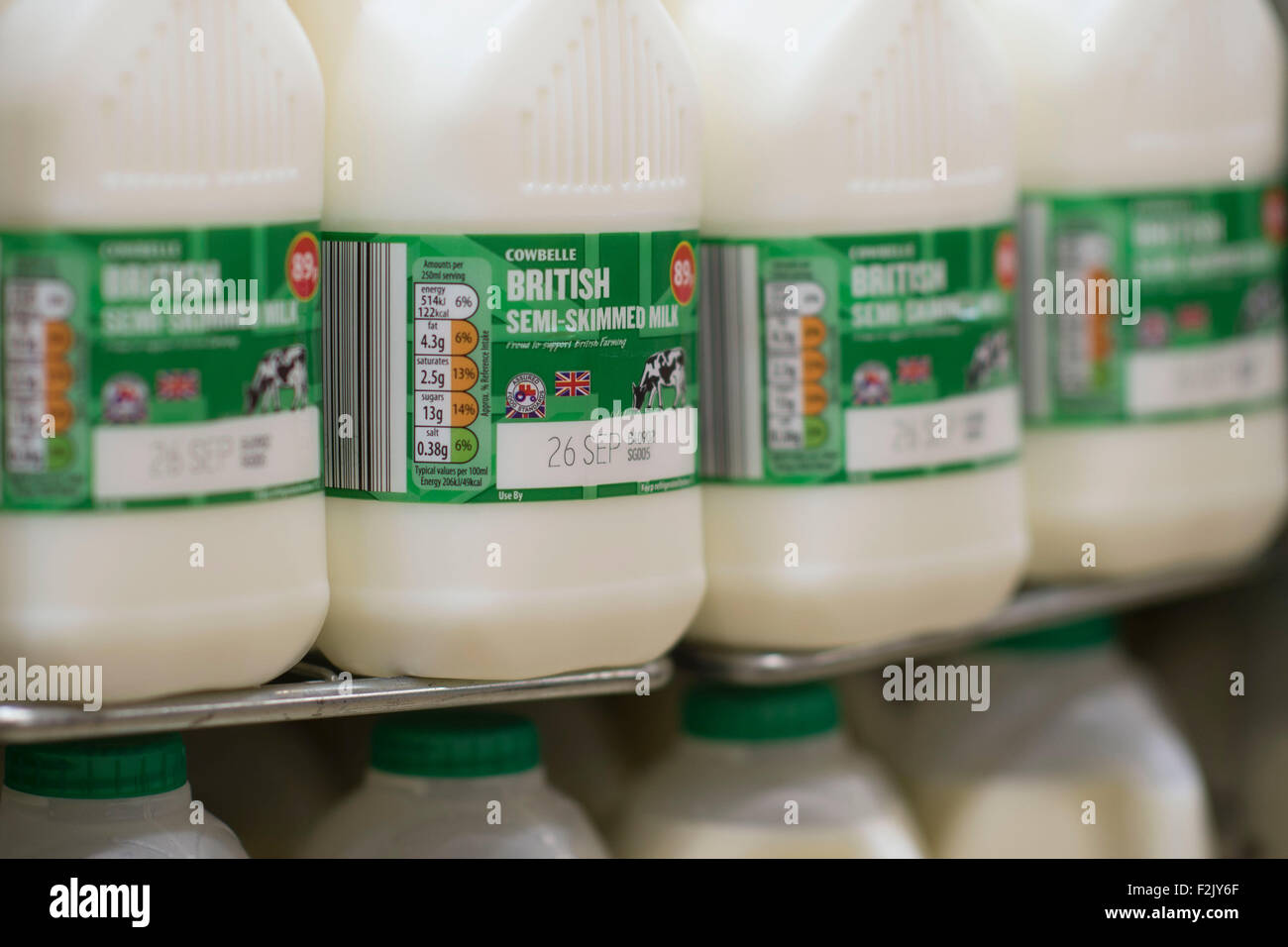 Delivery 7 days a week. Photo about Rows of shelves of pints and gallons of milk for sale in a local supermarket. 1 pint is 2 cups.